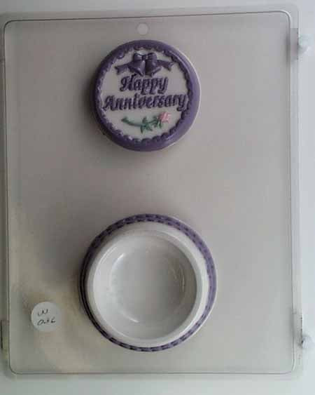 Molde para chocolate//caramelo , Caja para servir - Boda, redonda "Feliz aniversario" con dos campanas arriba y una rosa abajo. Caja para servir