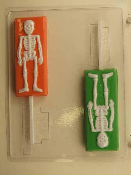 Molde para chocolate y caramelos, piruleta - Halloween, esqueleto sonriente sobre un rectángulo