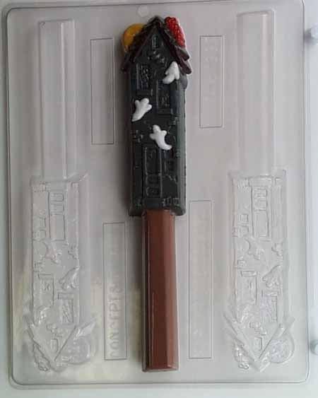 Molde de chocolate/caramelo, pretzel - Halloween, casa embrujada alta con fantasmas volando, vara de pretzel