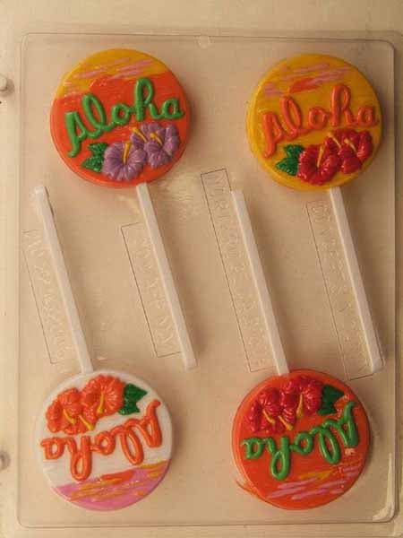 Chocolate// Candy Mold, Lollipop - Summer, "Aloha" in Script with Hibiscus on Round