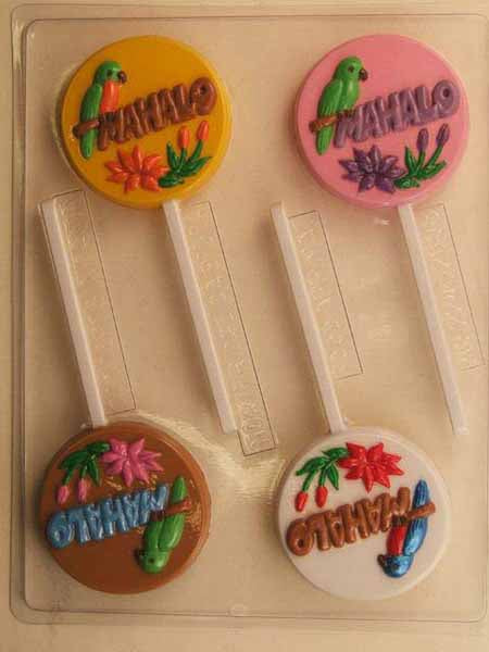 Chocolate// Candy Mold, Lollipop - Summer, "Mahalo" in Bubble Letters with Parrot and Lily on Round