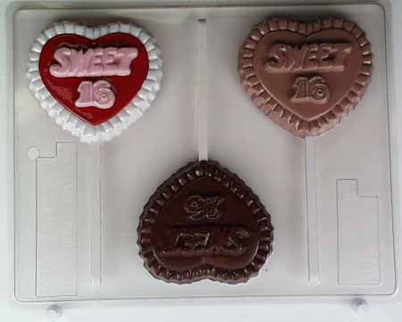 Chocolate// Candy Mold, Lollipop - Birthday, "Sweet 16" on Heart with Ruffled Edges